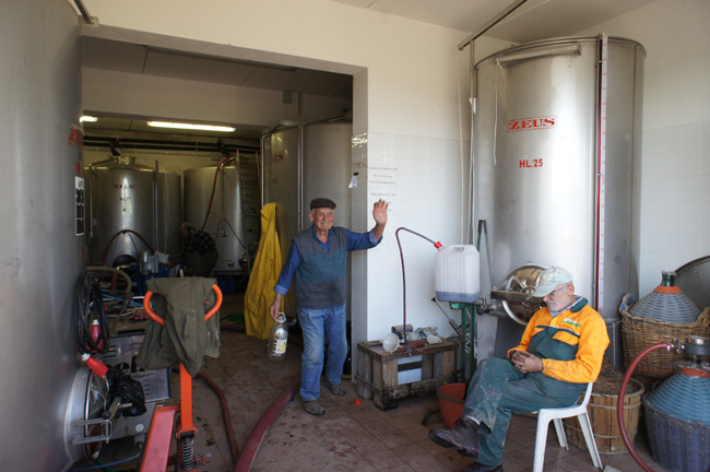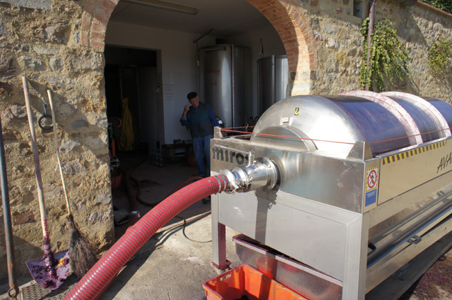 これは醸造中のワインを奥のタンクから出して、この機械で濾してまたタンクに戻す作業だそうです。絞りかすはグラッパの原料になるそうで大事に別の場所へと移していました。