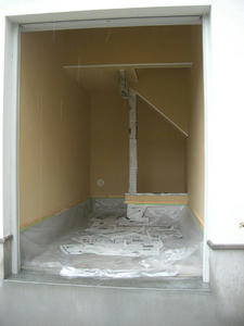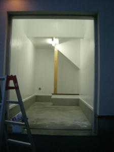 ここがKURIさんのガレージです。仕上げの費用をケチったため、仕上げ無しの石膏ボードむき出しの状態です。このまま使うつもりでしたが、なにか仕上げがあったほうが石膏ボードにも良いようなので、ペンキでも塗ってみることにしました。なぜか真壁に使うらしい柱とバンブーの笠木が笑えます。